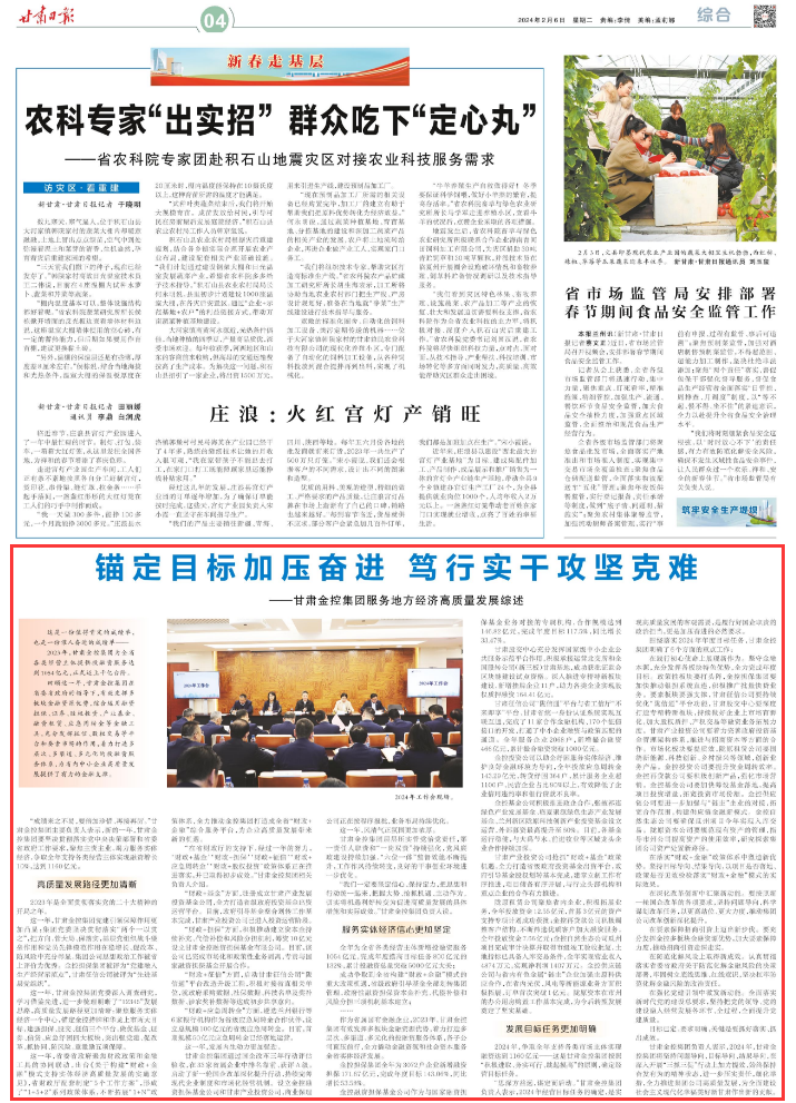 陇原租赁公司聚焦省内企业,积极拓展业务,全年投放资金12.55亿元,首募3亿元的资产支持专项计划成功获批;金控再贷款公司积极调整客户结构,不断筛选优质客户加大融资服务,全年投放资金7.66亿元;金控自然生态公司瓜州项目完成审计决算并取得市级竣工验收批复,土地指标已具备入库交易条件,全年实现营业收入4874万元,实现净利润1407万元;金控供应链公司与省内有色金属“链主”企业加强主原料供应合作,在省内光伏、风电等新能源业务方面积极拓展,订单首次突破1亿元;陇原资本在市州的办公用房购置工作基本完成,为今后转型发展奠定了坚实基础。