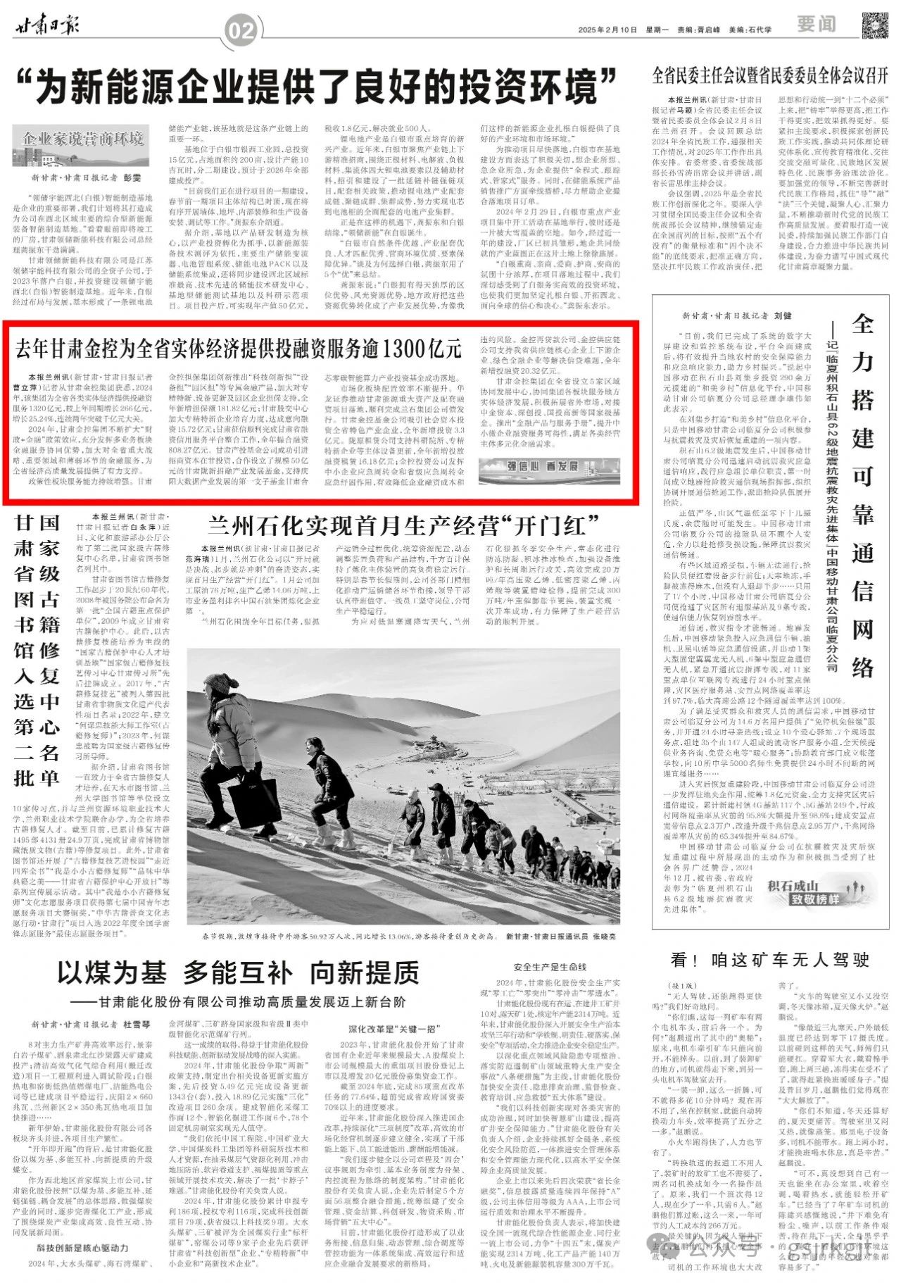 政策性板块服务能力持续增强。甘肃金控担保创新推出“科技创新担”“设备担”“园区担”等专属金融产品,加大对专精特新、设备更新及园区企业担保支持,全年新增担保额181.82亿元;甘肃股权交易中心加大专精特新企业培育力度,达成意向融资15.72亿元;甘肃征信顺利完成甘肃省融资信用服务平台整合工作,全年撮合融资808.27亿元。甘肃产投基金成功引进招商资本在甘投资,合作设立了规模50亿元的甘肃陇新招融产业发展基金,支持庆阳大数据产业发展的第一支子基金甘肃合芯零碳智能算力产业投资基金成功落地。