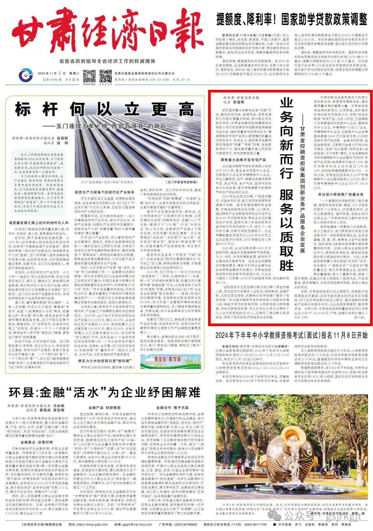 紧盯国家重大战略和全省“四强”行动,围绕科技创新、能源安全、绿色发展和乡村振兴等重点领域,突出就业优先服务导向,甘肃金控融资担保集团股份有限公司切实发挥政府性融资担保增信风险功能,推动存量有效的传统业务、精准聚焦的专项产品和小额便捷的批量业务同向发力、形成合力,撬动更多金融资源支持国家“两重”“两新”政策,在培育新质生产力、推动高质量发展上积极践行担保作为、有效贡献担保力量。