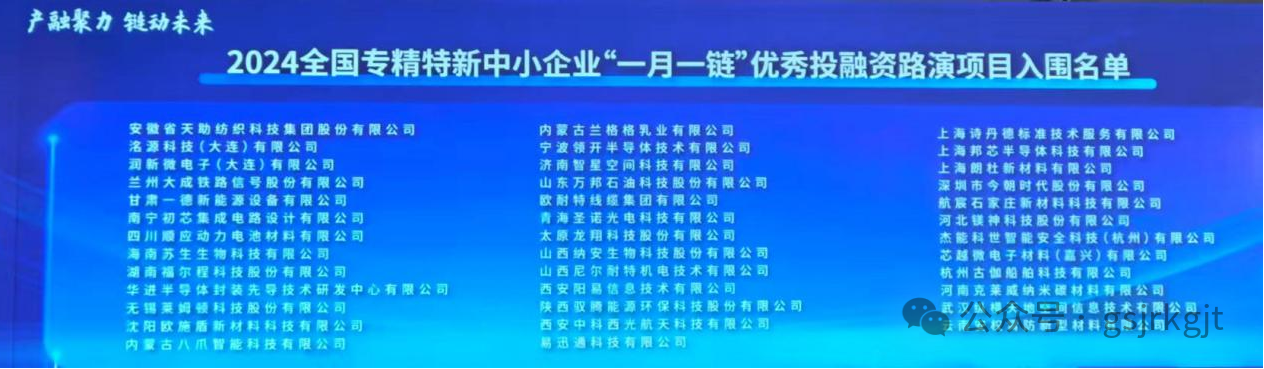 近日,“一月一链” 中小企业融资促进全国行上海站活动开启。全国 6 家专精特新中小企业在活动中进行了项目路演推介,其中甘肃股权交易中心“专精特新专板”挂牌企业兰州大成铁路信号股份有限公司和甘肃一德新能源设备有限公司成功入围 2024 年全国专精特新中小企业 “一月一链” 优秀投融资路演项目。